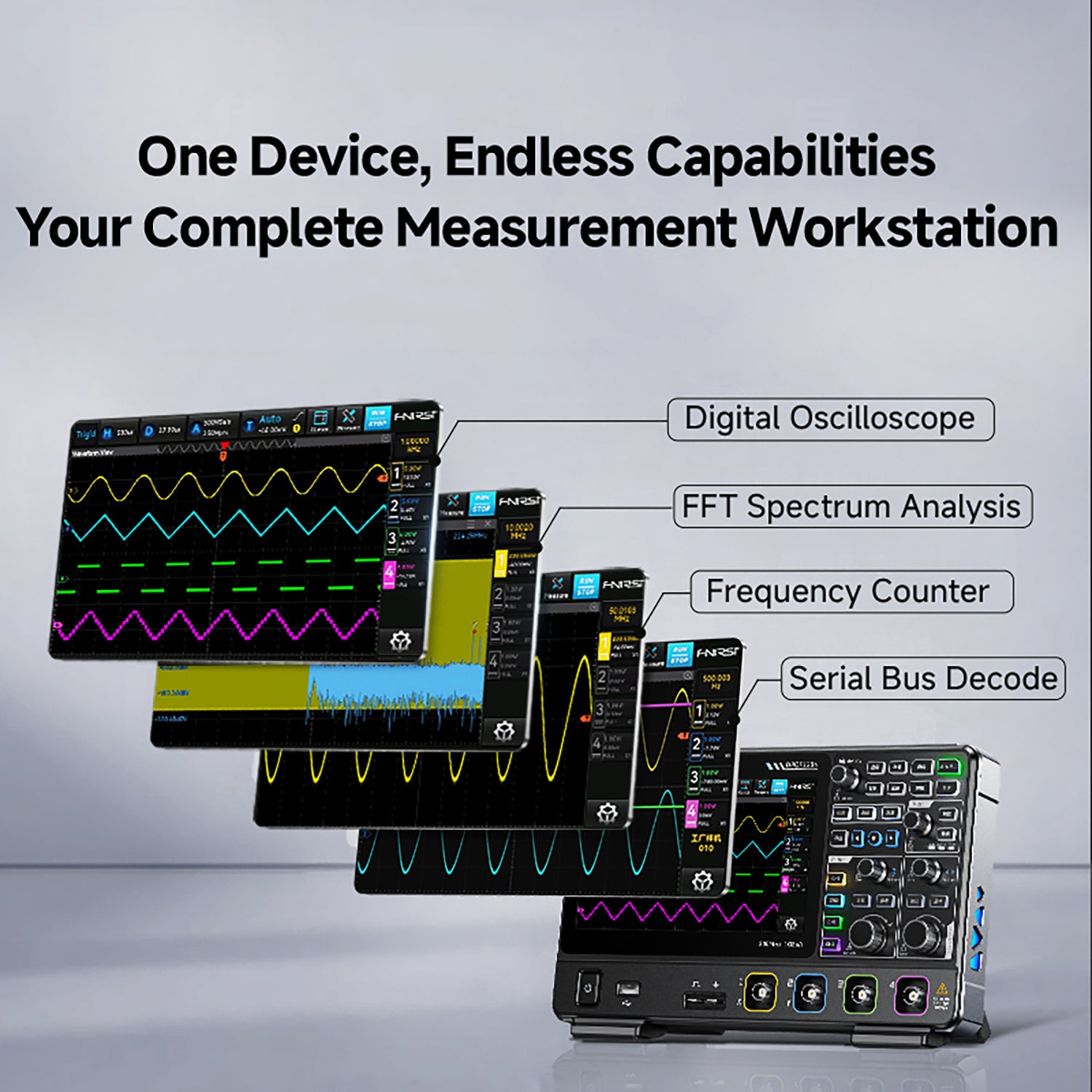 ◉ All-in-One Functionality – Oscilloscope + FFT + Counter + Decoder